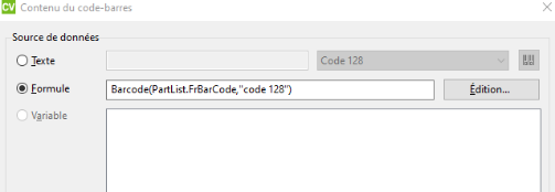 ex pour code barre: Barcode(PartList.FrBarCode,"code 128")