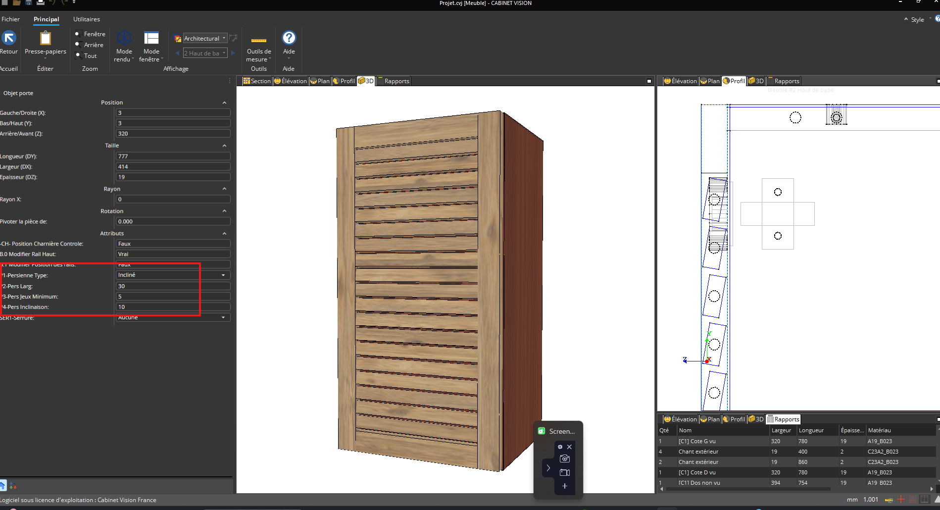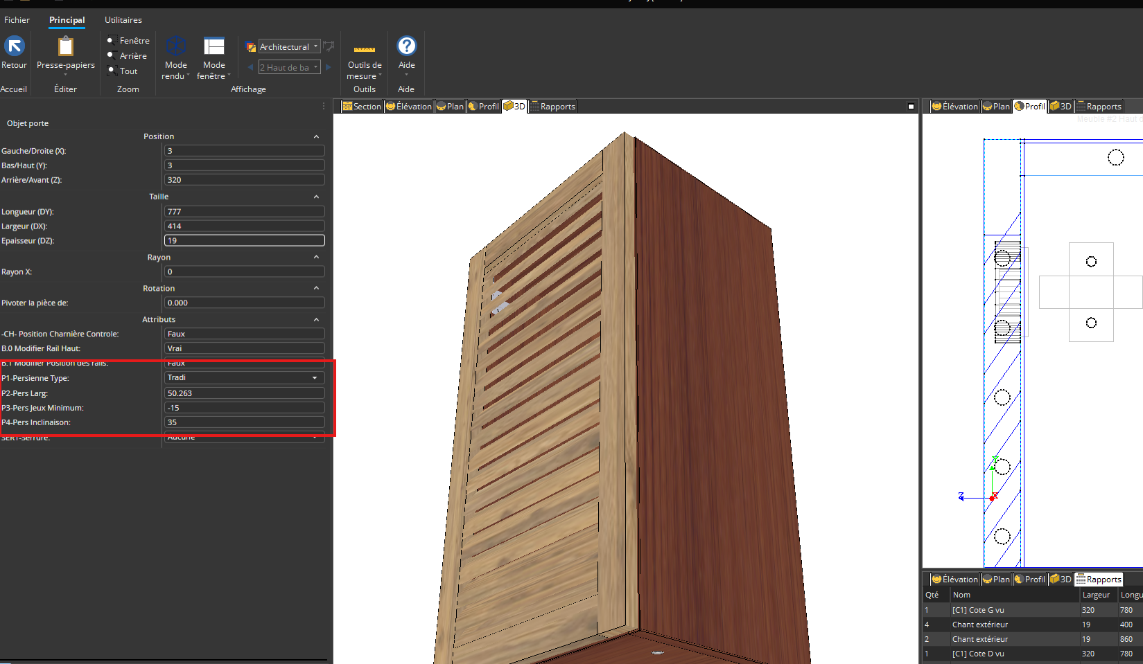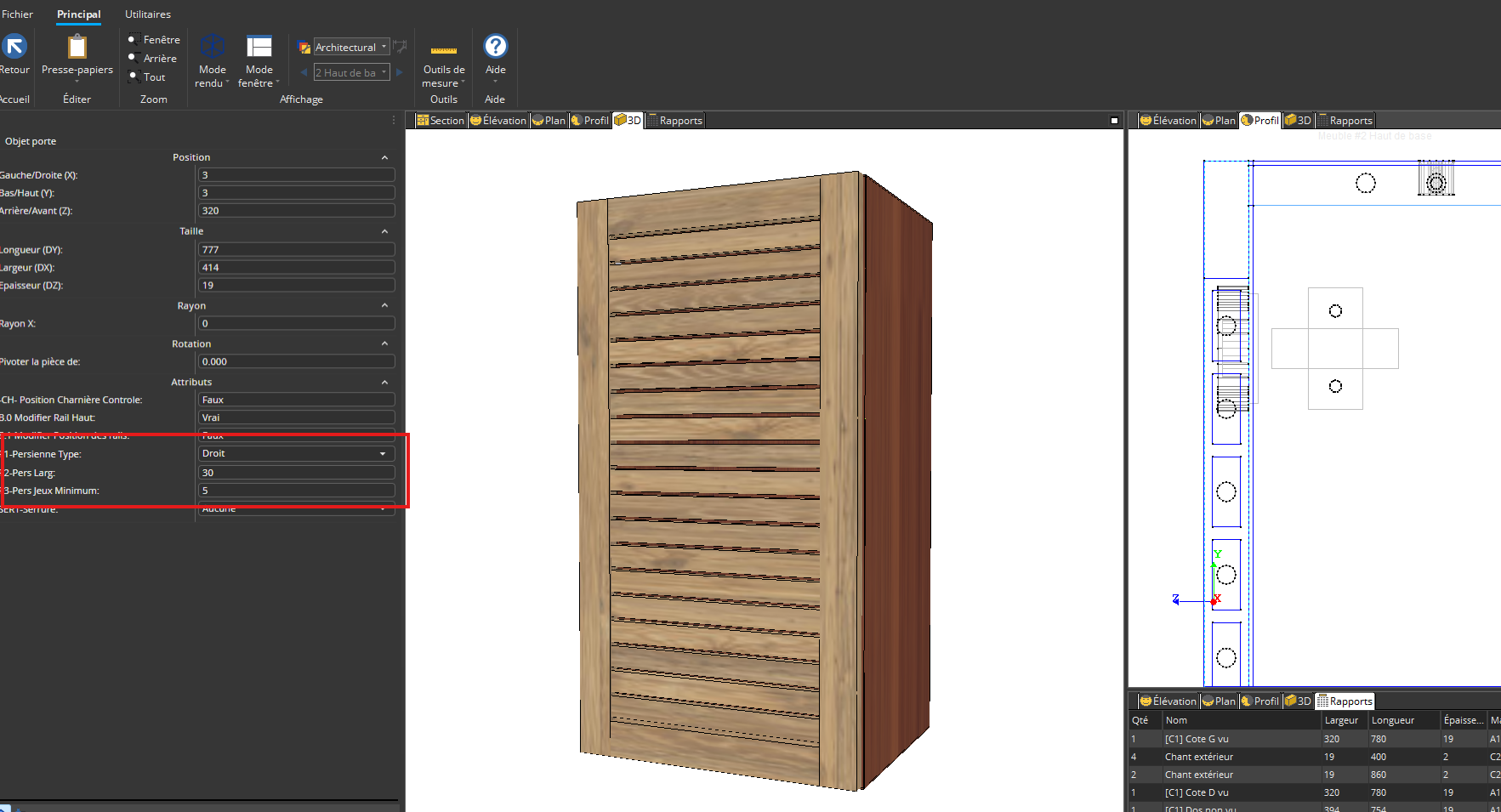 - Choisir niveau Projet, Salle, Meuble ou porte la Méthode de construction "Porte Persienne"