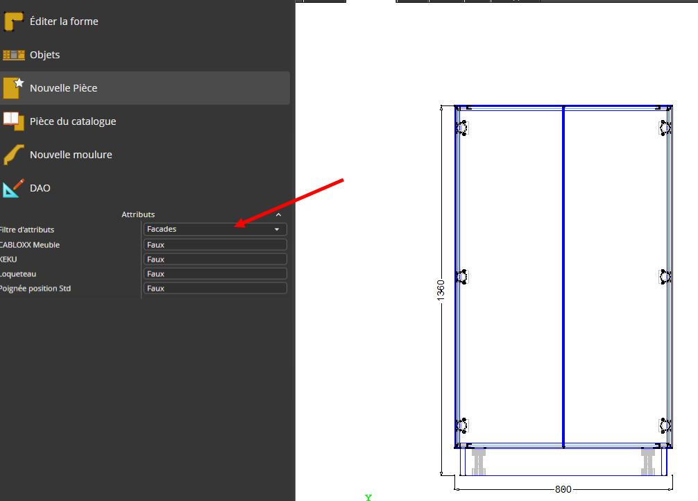En vu de section double clic sur la porte et forcer la charnière correspondante "Charnière EN coulissante pivotante Accuride 1432" ou "Charnière AP coulissante pivotante Accuride 1432"